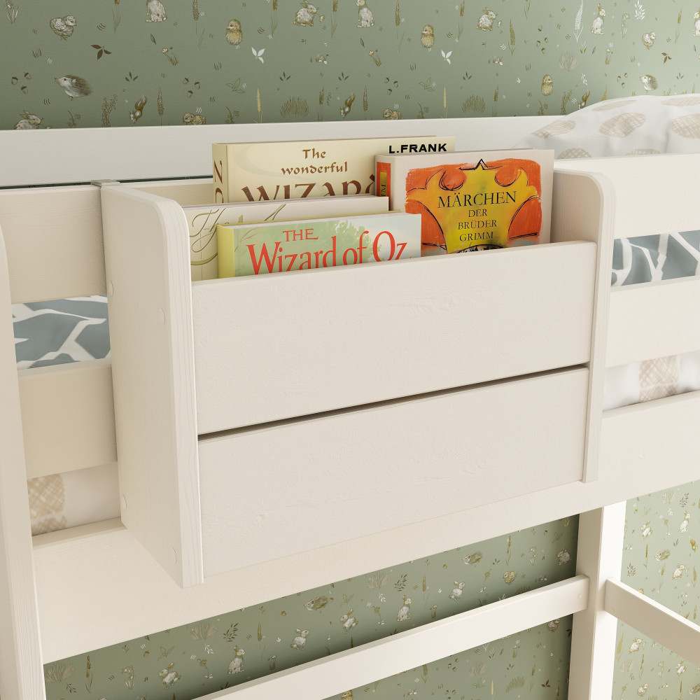 Ajoutez un accessoire indispensable à ce lit en hauteur : le caisson de rangement suspendu ! Vendu séparément, ce dernier s’accroche à la barrière supérieure, offrant au dormeur un espace de rangement accessible directement depuis son couchage. Parfait pour y déposer quelques livres, un doudou, une petite bouteille d’eau, etc.